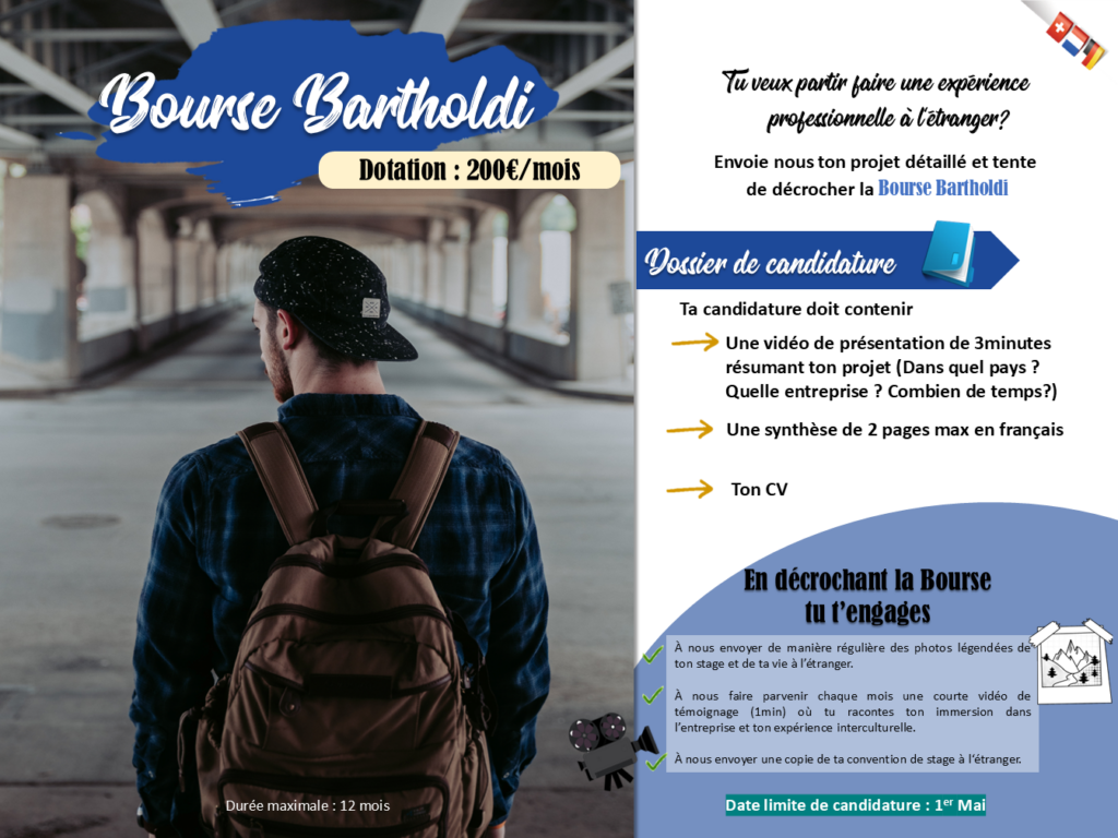 La Bourse du Prix Bartholdi s’adresse à tous les jeunes alsaciens, badois et suisses de moins de 30 ans souhaitant effectuer une expérience professionnelle à l’étranger (stage, VIE, apprentissage, job, service civique) dans les prochains mois.